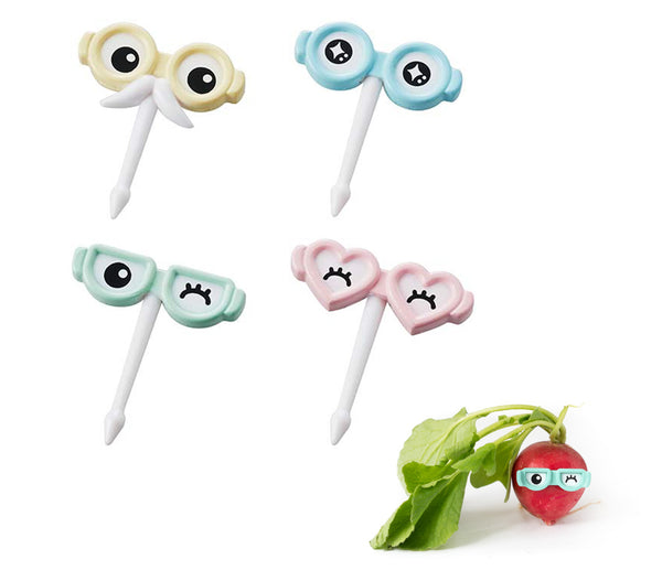 Mať občas na nose farebné okuliare a dívať sa na svet cez ne je také príjemné! Tak prečo by si tento pocit nemohli vychutnať aj rajčinky, jahody alebo vajíčka v boxíku vášho dobrobca? Sada okuliarnaté oči obsahuje 4 napichovátka - zelené, modré, ružové a žlté oči v okuliaroch.