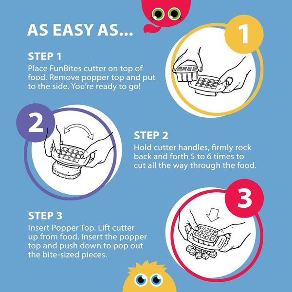 Vykrojte sendvič, syr alebo ovocie raz-dva – s Funbites žiadny problém. Tieto zábavné vykrajovátka sa neuveriteľne ľahko používajú, rozdelia váš chlieb na kúsky veľkosti sústa raz-dva a prinesú na jedálenský stôl veľa zábavy.